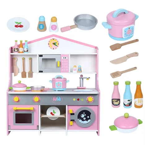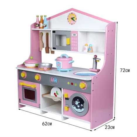 ครัวไม้ของเด็กมีอุปกรณ์ครบถ้วนทั้งหมด ประกอบด้วยชั้นใส่ของ, นาฬิกาบอกเวลา, เตาอบที่สามารถเปิดปิดฝาได้, ไมโครเวฟ, เครื่องซักผ้า, หม้อหุงข้าว, ซิ้งล้างจานและก๊อกน้ำ, ตะเเกรงวางจาน, ที่เเขวนมีดและตะหลิว, หัวเตาหมุนที่สามารถเปิดปิดได้, และเครื่องครัวที่มีหม้อ, กระทะ, มีด, ตะหลิว, ทัพพี, และขวดเครื่องปรุงอื่นๆ ด้วย. ขนาดของครัวมีขนาด 23×62×72 ซม. สามารถเล่นได้ตั้งแต่เด็กจนถึงวัยโต, เสริมสร้างจินตนาการและการเรียนรู้ ให้เด็กเพลิดเพลินไปกับบทบาทสมมุติที่น่าสนใจนี้ได้อย่างเต็มที่